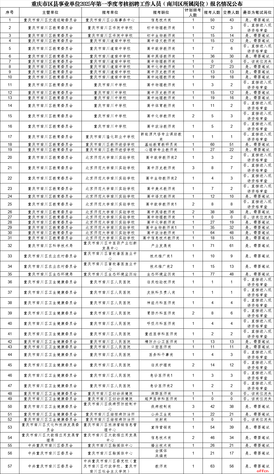 原標(biāo)題:重慶市區(qū)縣事業(yè)單位2025年第一季度考核招聘工作人員(南川區(qū)所屬崗位)報(bào)名情況公布