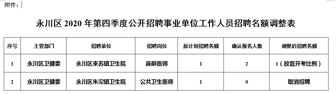 原標(biāo)題:關(guān)于調(diào)整永川區(qū)2020年第四季度公開招聘事業(yè)單位工作人員招聘名額的通告