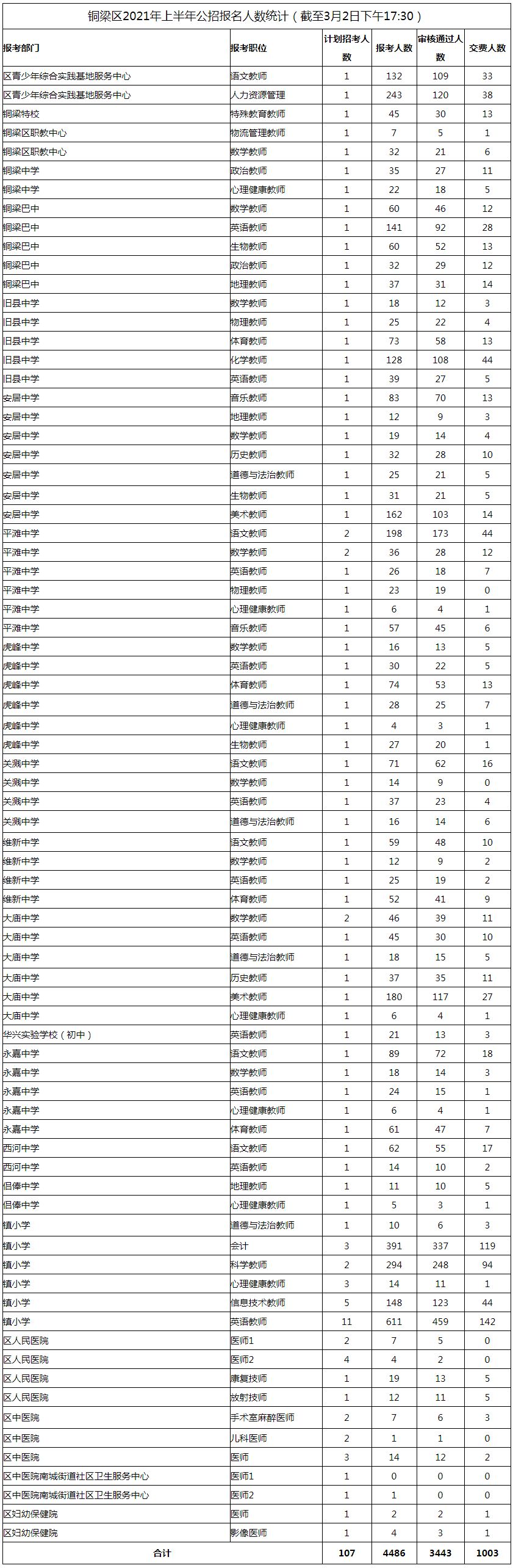 【導語】 2021年上半年銅梁區(qū)招聘報名統(tǒng)計4486人(截至3月2日下午17:30)現已發(fā)布,新公教育 為廣大考生整理此次公告內容如下,望各位考生及時查看切勿錯過報名時間。新公教 育為報考重慶事業(yè)單位考生提供備考資料、輔導用書、真題講義、筆試課程等內容, 歡迎各位考生加入備考QQ群 492550464一起學習!