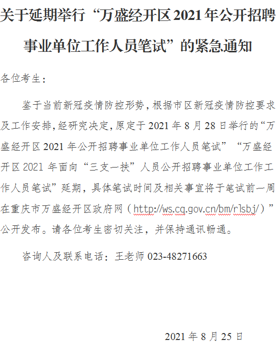 【導語】2021年萬盛經(jīng)開區(qū)公開招聘筆試延期緊急通知現(xiàn)已發(fā)布,新公教育 為廣大考生整理此次公告內(nèi)容如下,望各位考生及時查看切勿錯過報名時間。新公教 育為報考重慶事業(yè)單位考生提供備考資料、輔導用書、真題講義、筆試課程等內(nèi)容, 歡迎各位考生加入備考備考QQ群:949439669 一起學習!