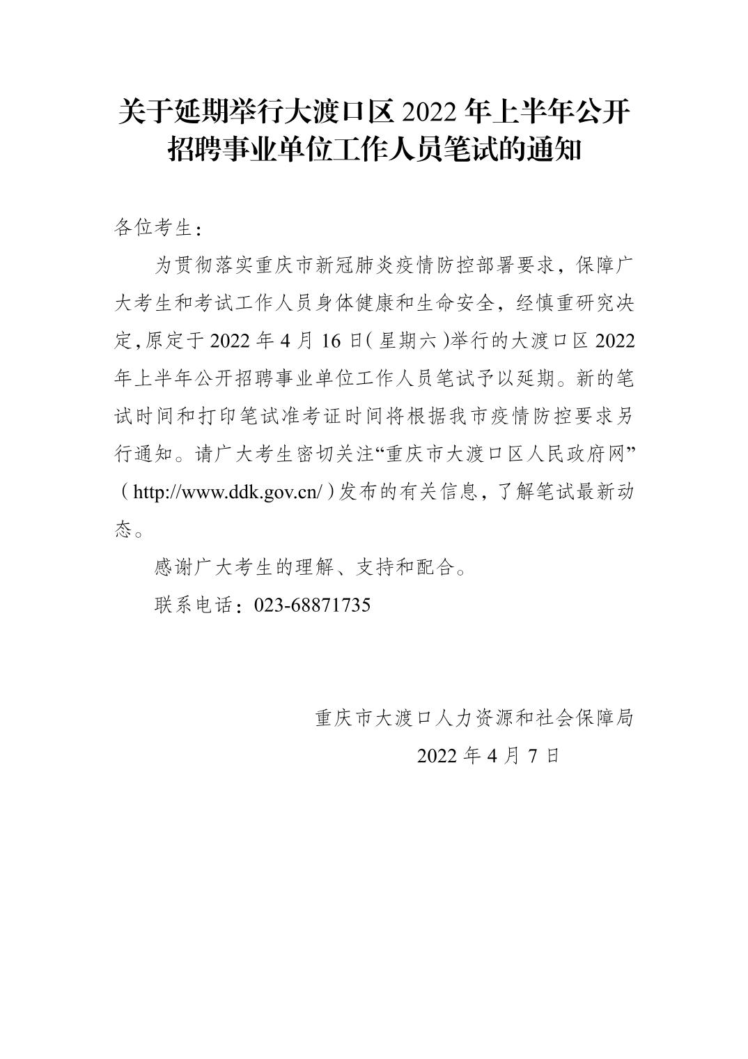 原標(biāo)題:關(guān)于延期舉行大渡口區(qū)2022年上半年公開(kāi)招聘事業(yè)單位工作人員筆試的通知