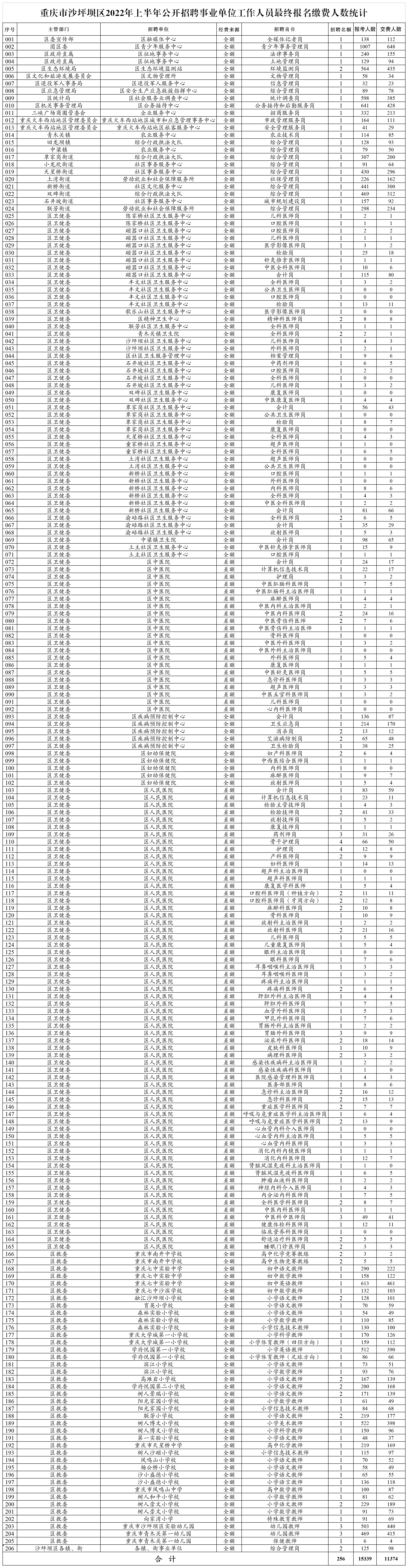 原標(biāo)題:重慶市沙坪壩區(qū)2022年上半年公開招聘事業(yè)單位工作人員最終報名繳費(fèi)人數(shù)統(tǒng)計