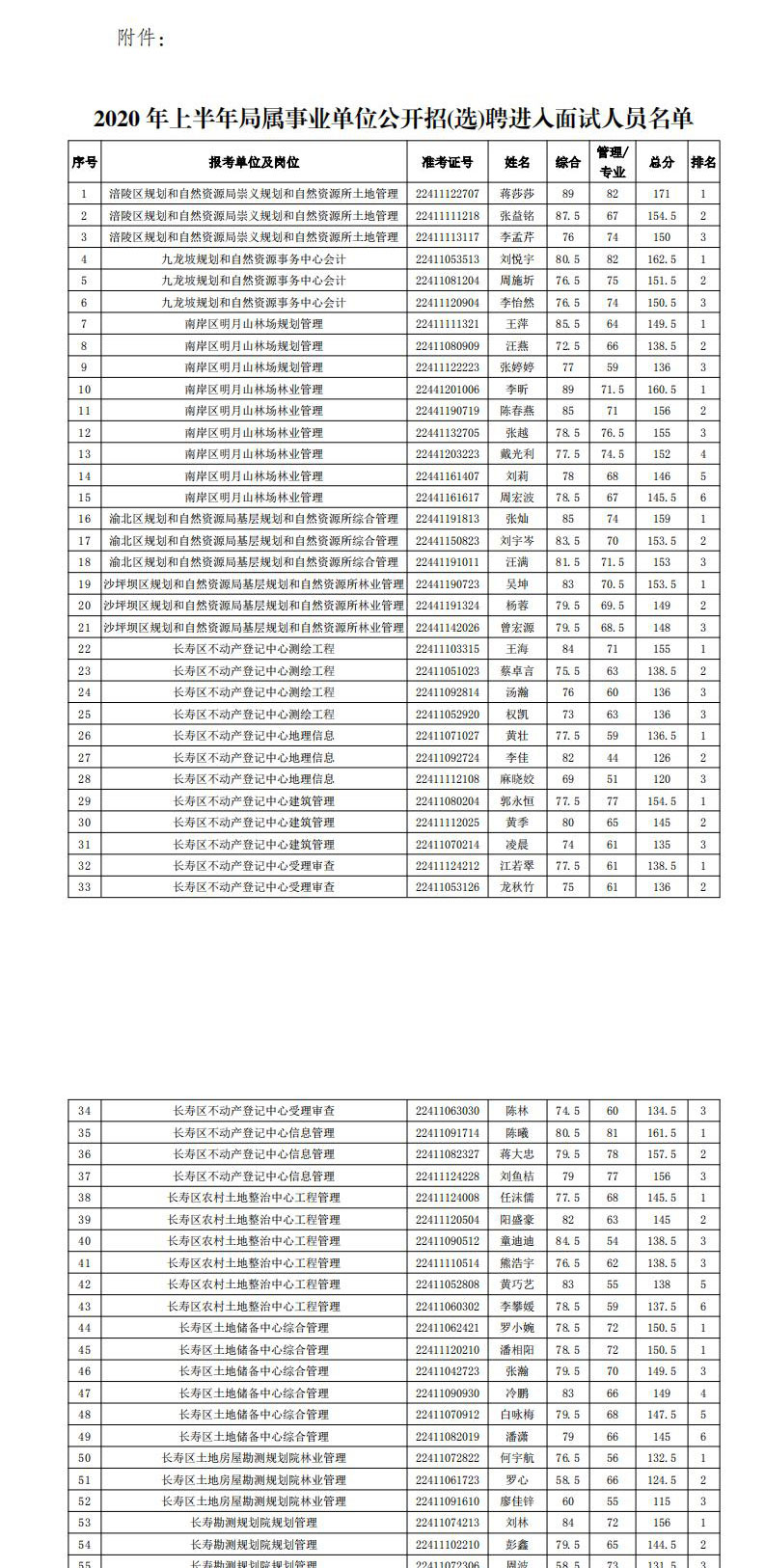 原標題:關(guān)于公布2020年上半年重慶市規(guī)劃和自然資源局所屬事業(yè)單位公開招(選)聘進入面試人員名單的通知