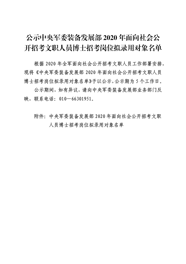 公示中央軍委裝備發(fā)展部2020年面向社會(huì)公 開招考文職人員博士招考崗位擬錄用對象名單