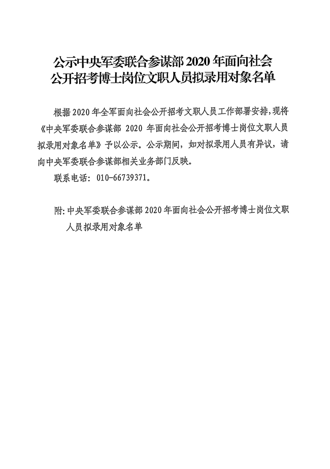 原標(biāo)題:公示中央軍委聯(lián)合參謀部2020年面向社會(huì) 公開(kāi)招考博士崗位文職人員擬錄用對(duì)象名單