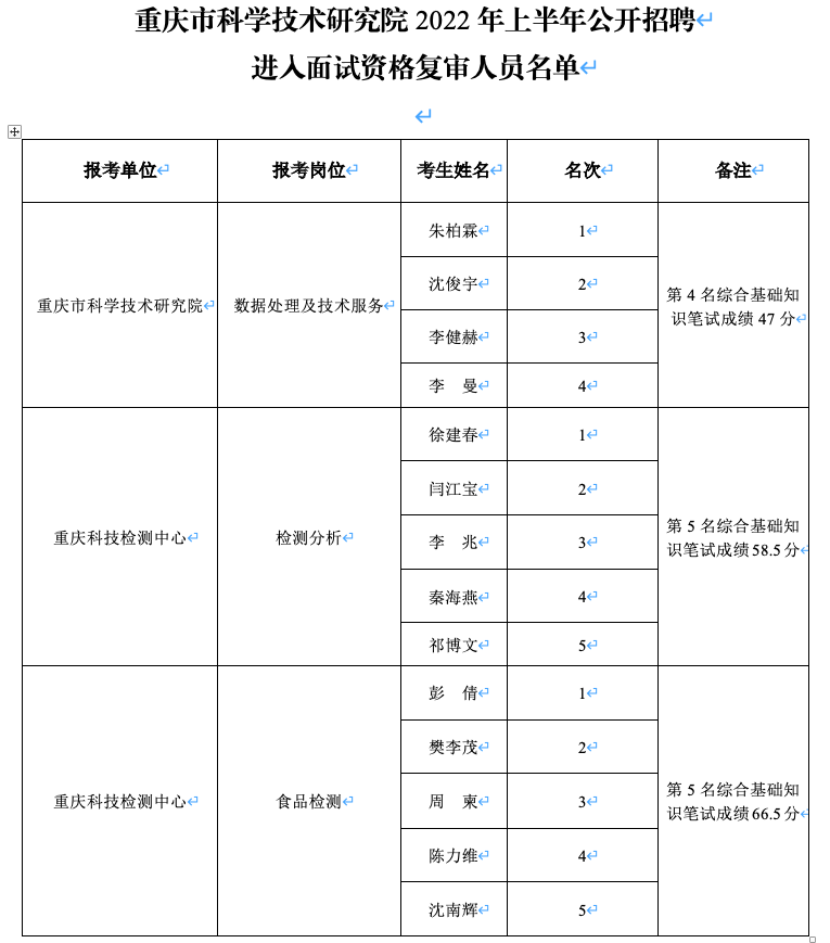 原標(biāo)題:重慶市科學(xué)技術(shù)研究院2022年上半年公開招聘 進(jìn)入面試資格復(fù)審人員名單公示
