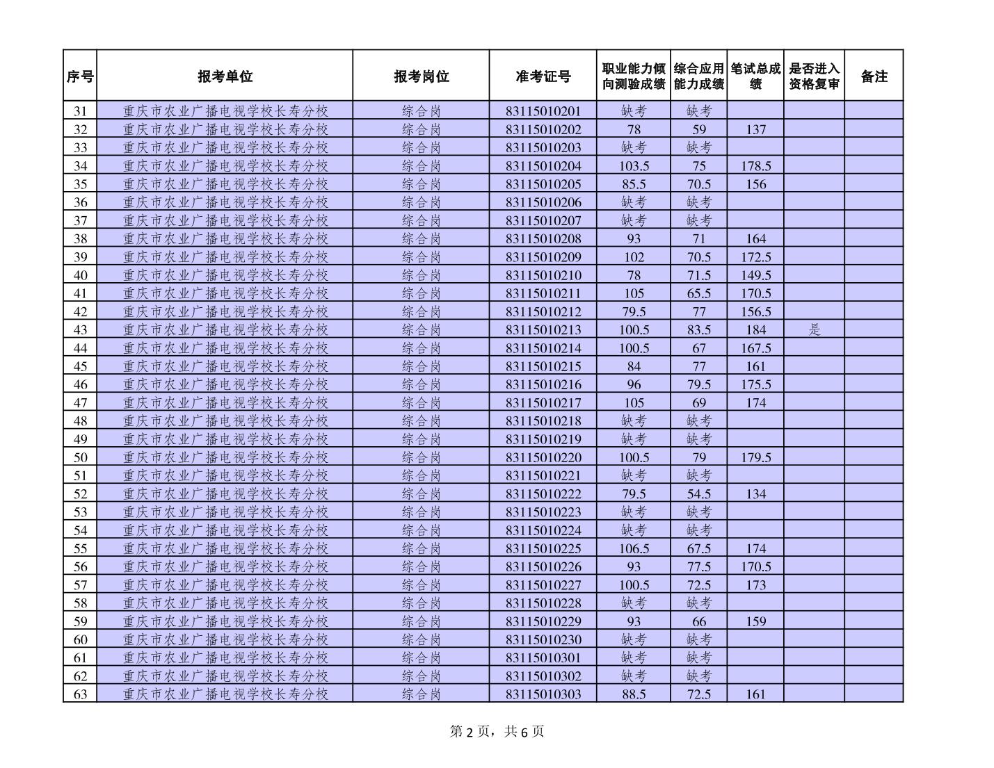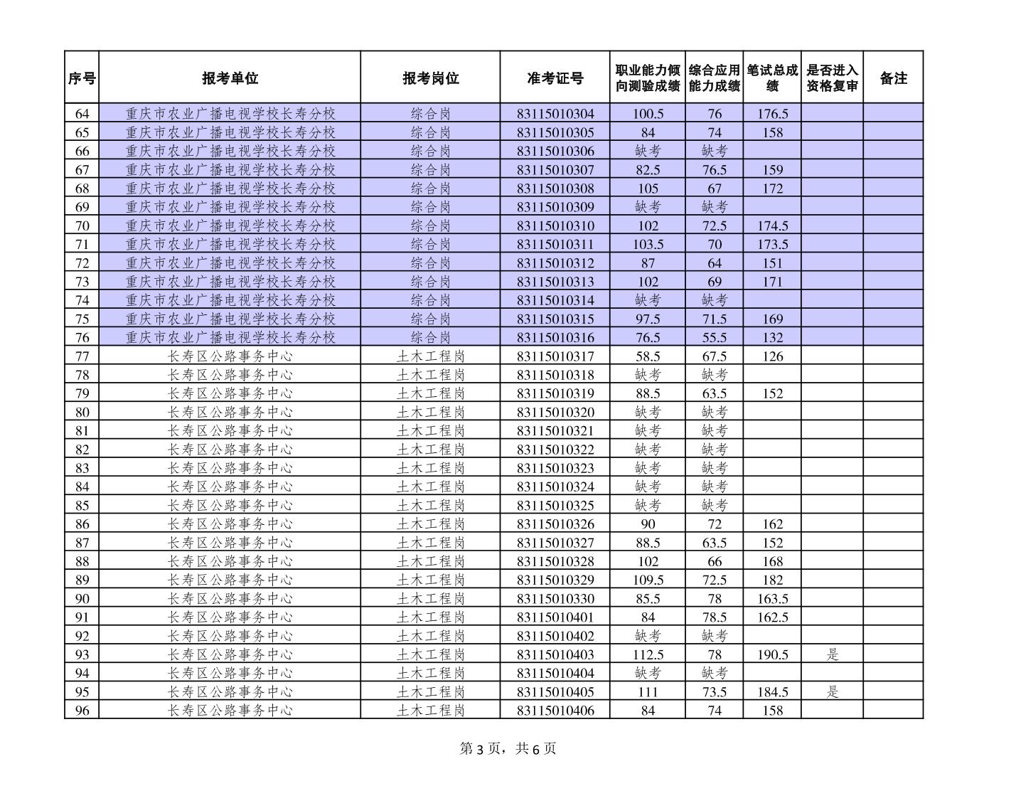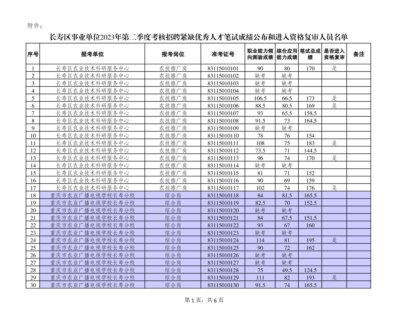 附件:長壽區(qū)事業(yè)單位2023年第二季度考核招聘緊缺優(yōu)秀人才筆試成績公布和進入資格復審人員名單