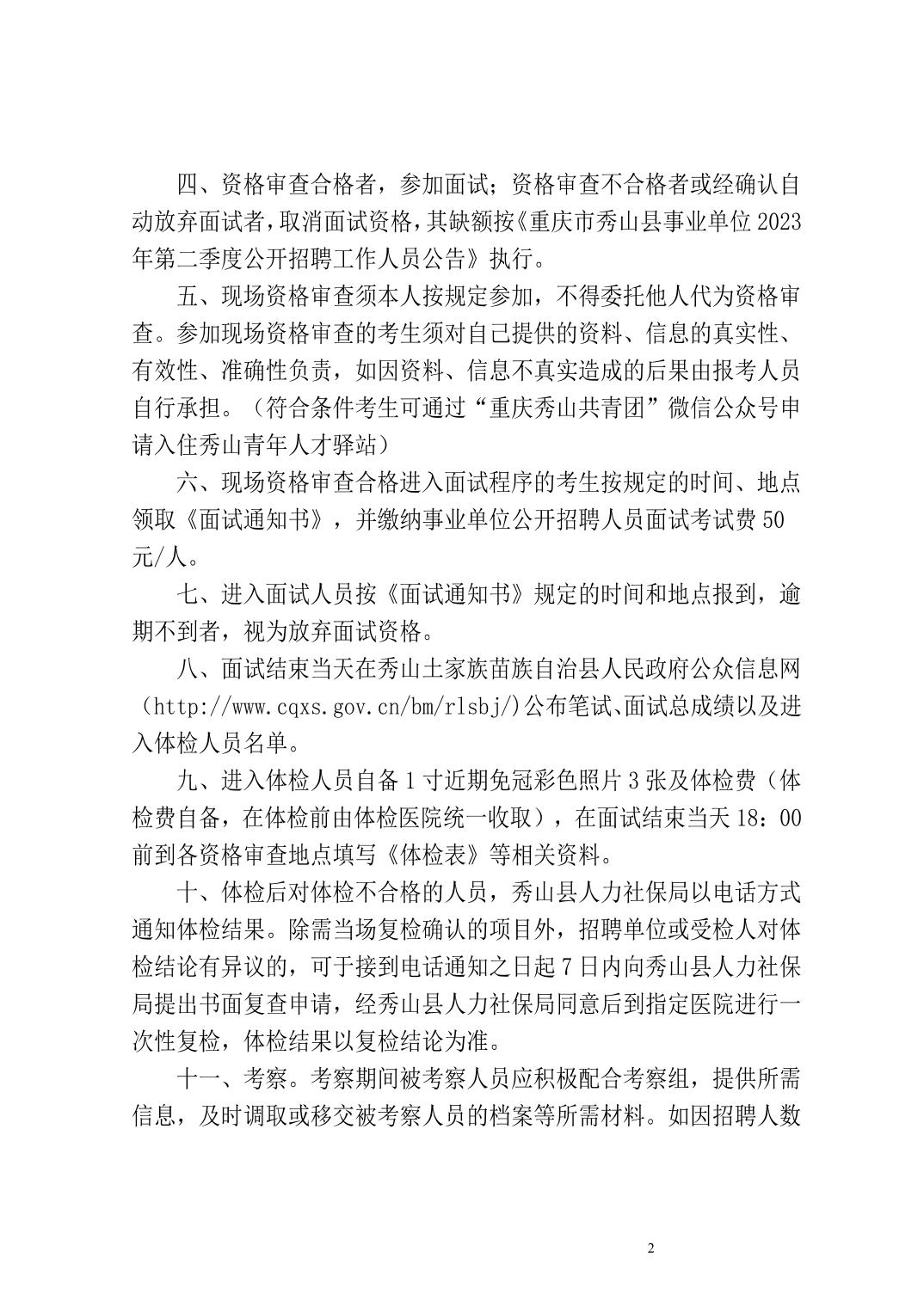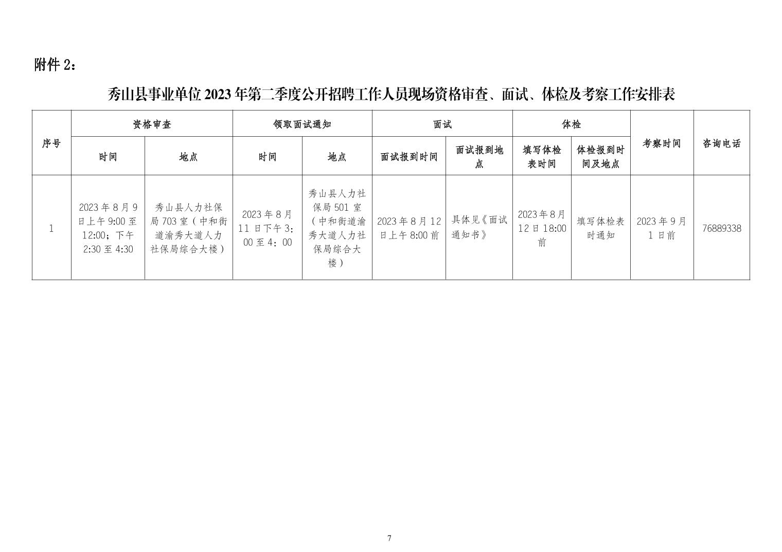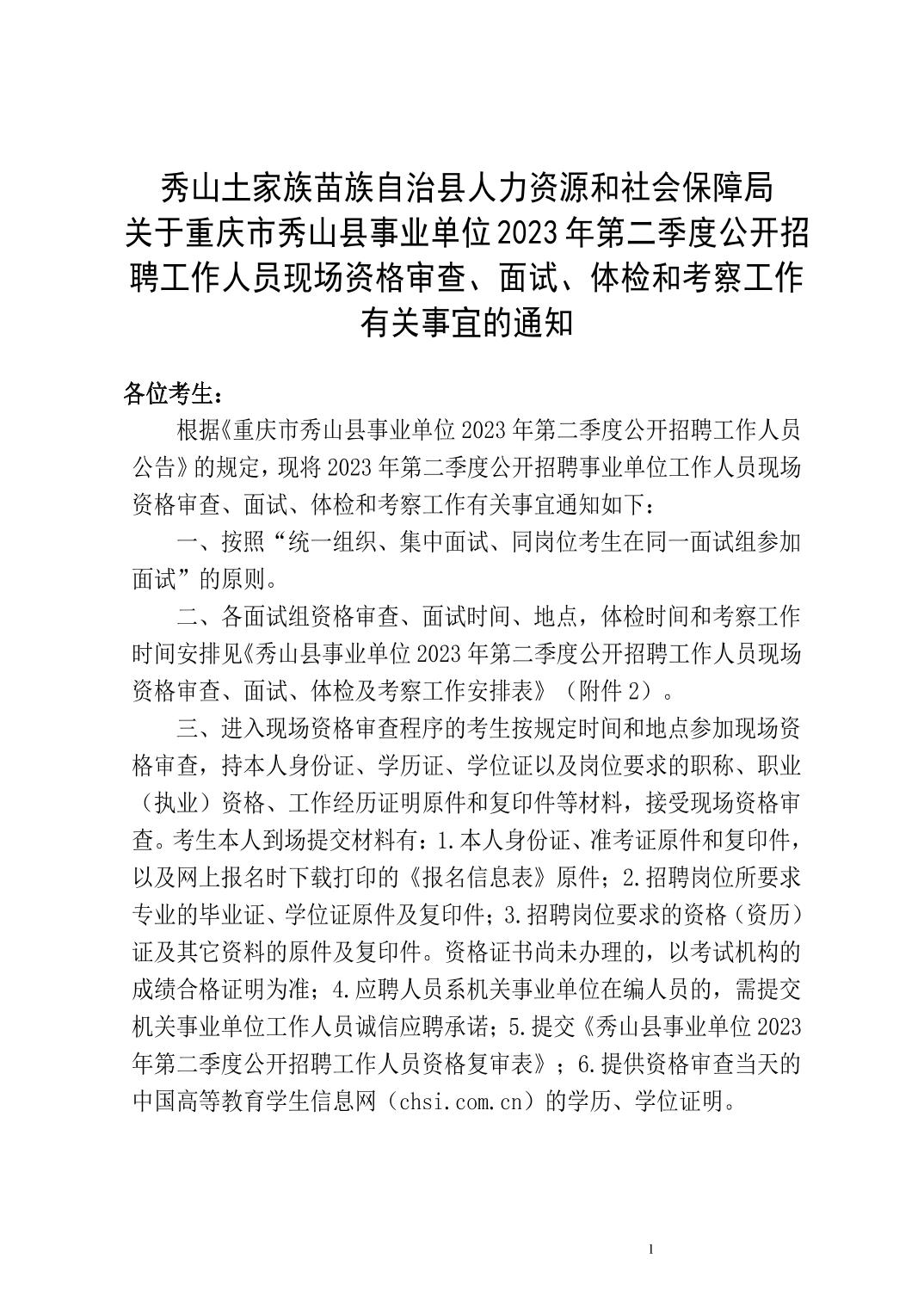 原標題:關(guān)于重慶市秀山縣事業(yè)單位2023年第二季度公開招聘工作人員現(xiàn)場資格審查、面試、體檢和考察工作有關(guān)事宜的通知