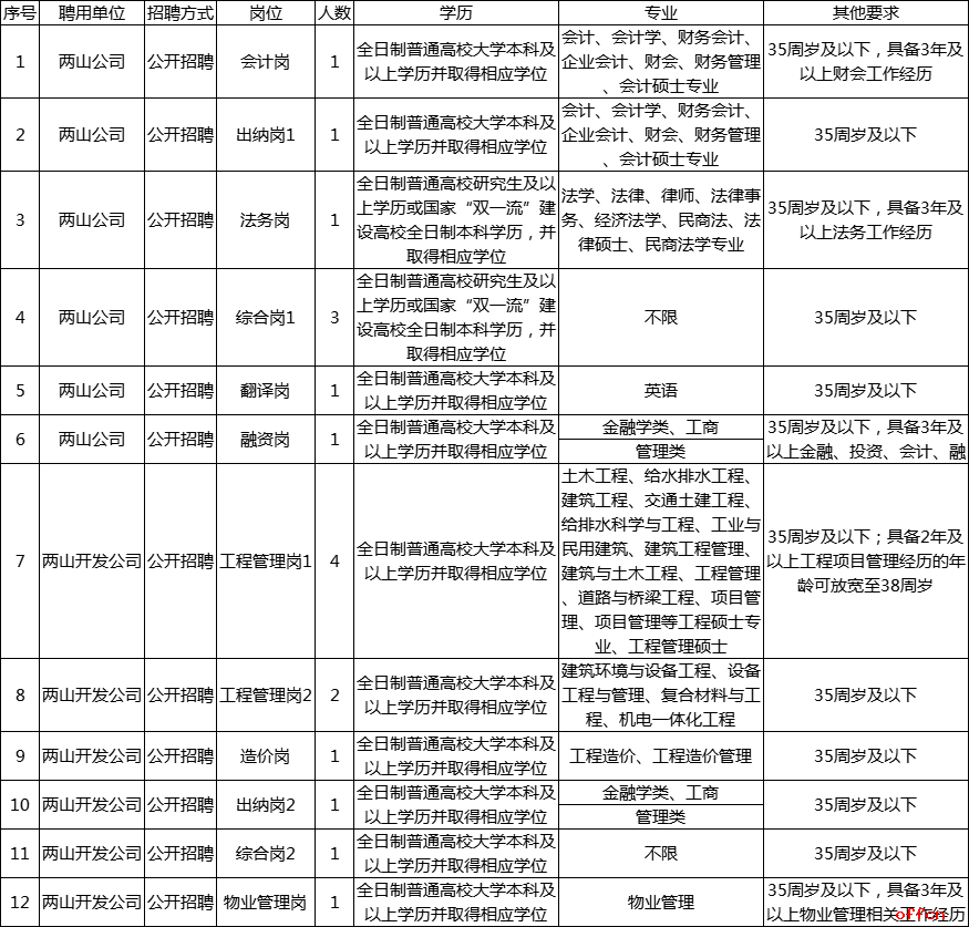 兩山公司招聘工作人員8名;兩山開發(fā)公司招聘工作人員10名,共計(jì)18名(具體崗位見招聘崗位信息及具體要求)。