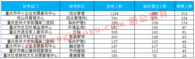 過審前十的崗位中有七個崗位報名人數(shù)排在前十,排在前兩位的均超過500人過審。重慶市中小企業(yè)發(fā)展服務(wù)中心-綜合管理崗位是目前過審人數(shù)最多的崗位,同時也是報名人數(shù)最多的崗位,此崗位僅招考一人,但國民教育本科以上學(xué)歷即可報,且不限專業(yè),無政治面貌要求,年齡限制在35周歲以下,因此成為火爆職位。鐵山坪管理中心-綜合管理崗位1要求全日制本科及以上學(xué)位,同時還要求報考人員為黨員(含預(yù)備黨員),但此崗位不限專業(yè),屬于市紀(jì)委,招考6人,因此報考人數(shù)較多。