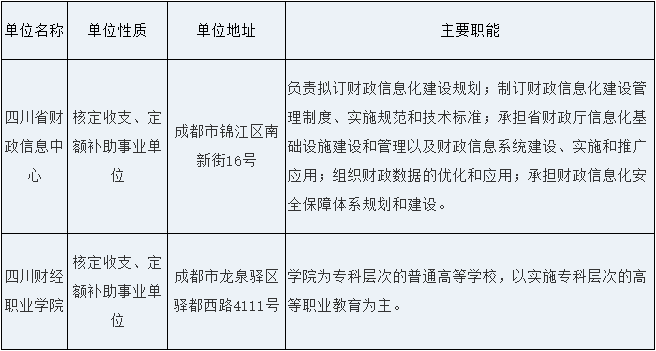 根據(jù)《事業(yè)單位人事管理條例》、《事業(yè)單位公開招聘人員暫行規(guī)定》和《四川省省屬事業(yè)單位公開招聘工作人員實施細則(試行)》等有關規(guī)定,省財政廳擬面向社會公開招聘部分工作人員補充到四川省財政信息中心、四川財經(jīng)職業(yè)學院工作?,F(xiàn)將公開招聘有關事項公告如下(本公告由省財政廳在四川省人力資源和社會保障廳官網(wǎng)[rst.sc.gov.cn,下同]“人事考試”專欄上發(fā)布)。