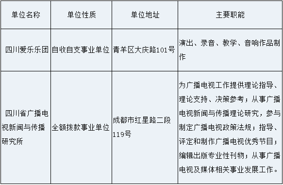 根據(jù)《事業(yè)單位人事管理?xiàng)l例》、《事業(yè)單位公開招聘人員暫行規(guī)定》和《四川省省屬事業(yè)單位公開招聘工作人員實(shí)施細(xì)則(試行)》等有關(guān)規(guī)定,四川廣播電視臺(tái)擬面向社會(huì)公開招聘部分工作人員補(bǔ)充到直屬事業(yè)單位四川愛樂樂團(tuán)、四川省廣播電視新聞與傳播研究所工作。現(xiàn)將公開招聘有關(guān)事項(xiàng)公告如下(本公告由四川廣播電視臺(tái)同時(shí)在四川省人力資源和社會(huì)保障廳官網(wǎng)[rst.sc. gov.cn,下同]“人事考試”專欄和四川廣播電視臺(tái)網(wǎng)站 [www.sctv.com,下同]上發(fā)布。