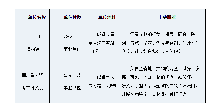本次招聘均在事業(yè)單位經(jīng)批準(zhǔn)設(shè)置的崗位內(nèi)招聘,招聘名額為28名,其中四川博物院20名、四川省文物考古研究院8名,具體崗位見(jiàn)《崗位和條件要求一覽表》。