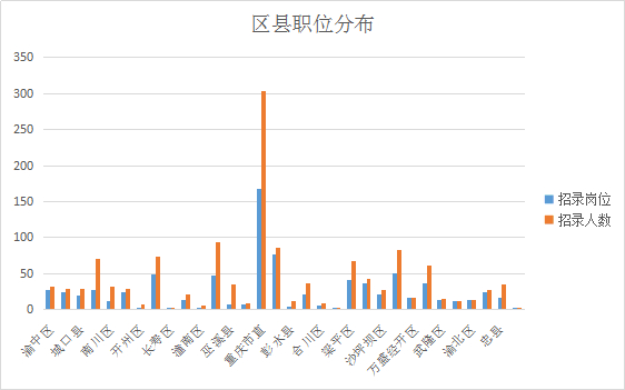 今年,重慶公務(wù)員招錄崗位涉及32個(gè)區(qū)縣,巴南、南岸、江北、九龍坡區(qū)、墊江、大足、榮昌及兩江新區(qū)皆沒有單獨(dú)招聘的崗位,但市直崗位有部分分布在這些區(qū)縣。2019年重慶市直崗位招錄崗位168個(gè),總招錄人數(shù)304人,占總招錄人數(shù)的22.9%。