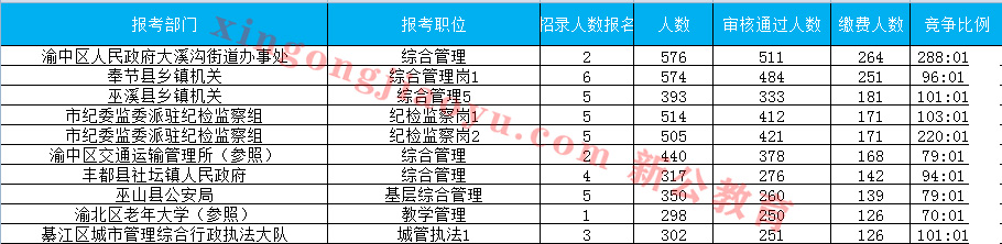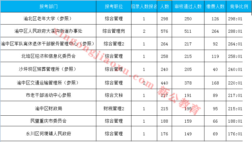 截至27日14:26,競爭比最高的是渝北區(qū)老年大學(xué)(參照)一職,招錄1人,報名人數(shù)為298人,競爭比例達298:1,本崗位屬于三不限,本科學(xué)士及以上即可報名,而且工作地點在主城區(qū)范圍,因此報考的人數(shù)相對較多。緊跟其后的是渝中區(qū)人民政府大溪溝街道辦事處,招錄2人,報名576,報錄比為288:1。