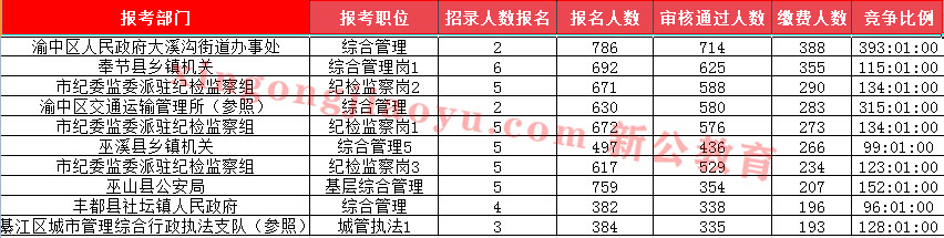距離報(bào)名時(shí)間截止還有一天時(shí)間了,希望各位同學(xué)們抓緊時(shí)間報(bào)名。畢竟到最后一天可能會(huì)出現(xiàn)服務(wù)器擁堵的情況,造成報(bào)名失誤。重慶新公教育小編給大家整理匯總了重慶人事 考試網(wǎng)發(fā)布的28日交費(fèi)前十職位!供大家參考。