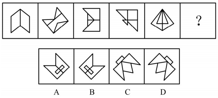 【解析】答案:C項(xiàng)。前五幅圖形中,后面一幅圖形的對(duì)稱軸由前一幅圖形的對(duì)稱軸逆時(shí)針旋轉(zhuǎn)45度得到,可以排除B、D兩項(xiàng)。再觀察,奇數(shù)項(xiàng)圖形的對(duì)稱軸和圖形中的一條線重疊。偶數(shù)項(xiàng)圖形的對(duì)稱軸經(jīng)過(guò)圖形的幾個(gè)交點(diǎn),故排除A項(xiàng),選擇C項(xiàng)。