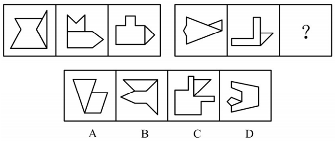 【解析】答案:D。第一組三幅圖,每幅圖中的兩個(gè)小圖形對(duì)稱軸相互垂直。第二組三幅圖,每幅圖兩個(gè)小圖形對(duì)稱軸相互平行。選項(xiàng)中只有D項(xiàng)兩個(gè)小圖形對(duì)稱軸相互平行,可選。